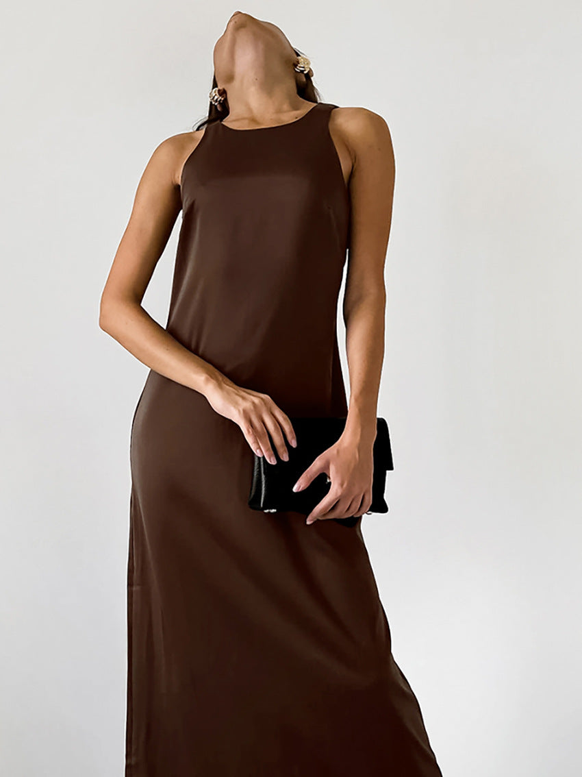 The Sleeveless Satin Maxi Dress is the epitome of understated elegance.With its sleek silhouette and rich mocha hue, this dress exudes a refined sophisticationperfect for both formal and casual settings.The round neckline and sleeveless designhighlight your shoulders and neckline,while the satin finish adds a subtle sheen, elevatingthe overall look. Whether you're attending a cocktail event or enjoying a night out, thisdress pairs beautifully with statement jewelry and heels for a polished, timeless ensemble.