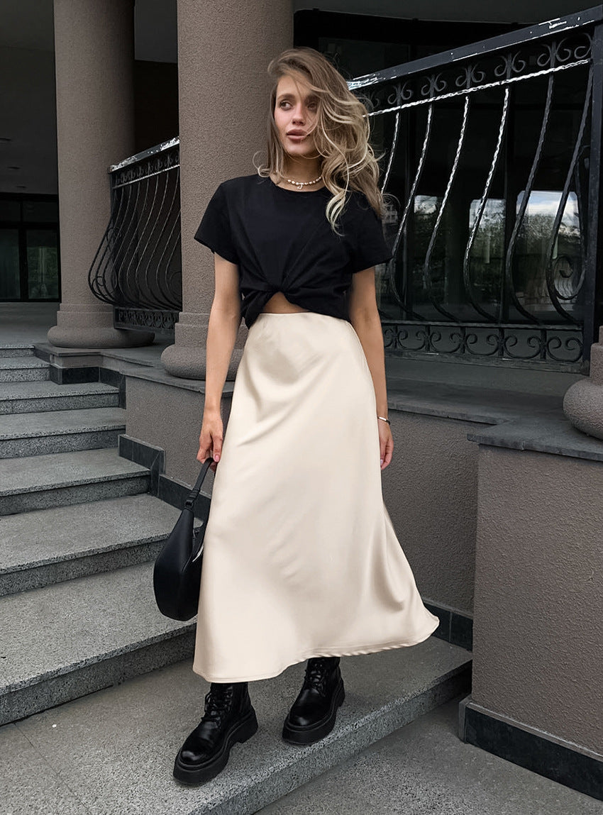 The Solid Satin Skirt is a universally flattering, full-length silk skirt with endless versatility. It hugs your curves gently, revealing a delicate, pleated hem.