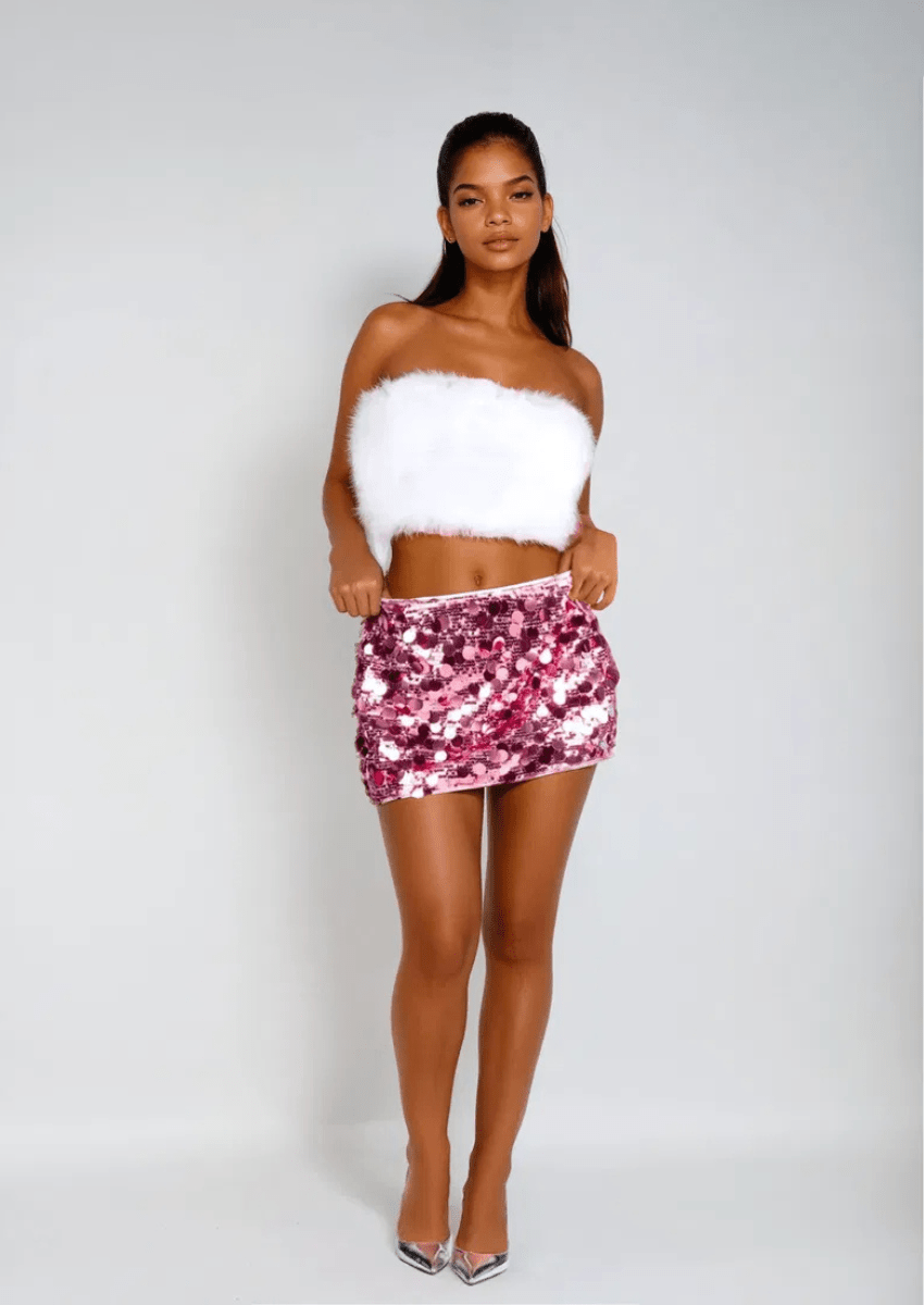 Step into the spotlight with the Sparkle Queen Mini Skirt. a dazzling statement piece designed to turn heads wherever you go. Adorned with oversized. shiny sequins that catch the light at every angle. this skirt is your ultimate go-to for parties. celebrations. or when you simply want to shine.