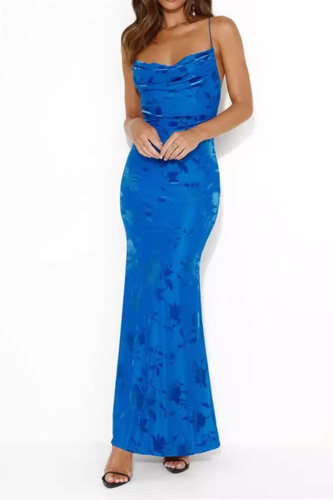 The Strappy Floral Burnout Maxi Dress, made out of a luxe devore fabric, center back invisible zip, elastic spaghetti straps, cowl neckline, stretch and lining throughout the garment.