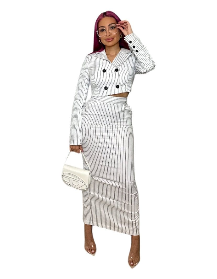 This pinstripe suit set combines style and functionality for a sophisticated and professional appearance. The cropped long sleeves are adorned with four button details. while the ankle-length pencil skirt adds a contemporary touch. making it perfect for any formal occasion.