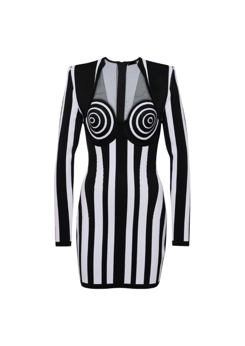 Make a statement with our Striped Knit Bodycon Dress. designed to hug your curves in all the right places. The bold stripe pattern adds a modern. eye-catching touch. while the soft knit fabric ensures a comfortable fit that moves with you. Whether you're heading to a cocktail party. dinner date. or stylish brunch. this dress will have you looking effortlessly put-together.