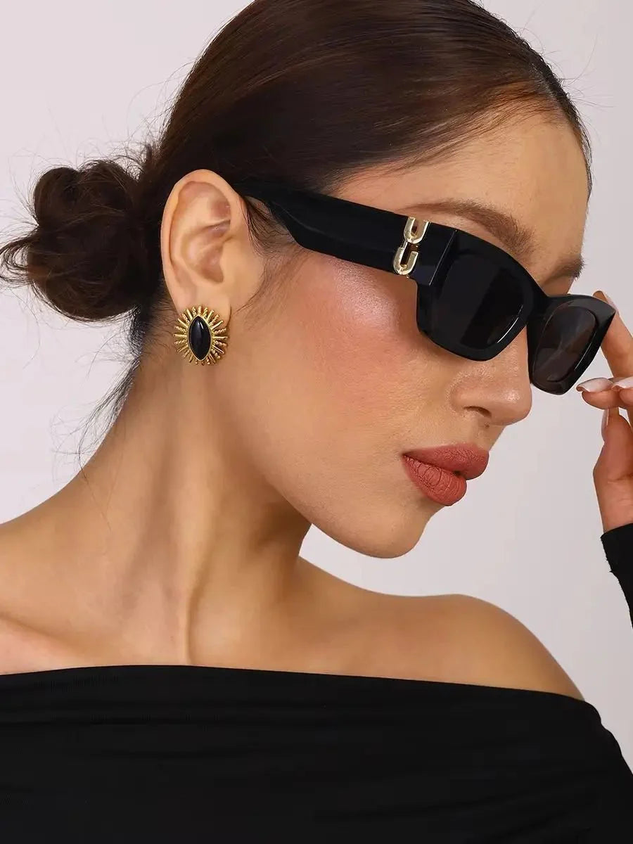 Elevate your style with the Sunburst Earrings. a pair of timeless studs that radiate sophistication and charm. Featuring an intricate gold-toned sunburst design. these earrings are centered with a striking black marquise-shaped stone that draws attention effortlessly. Designed to last and dazzle. they are the perfect addition to your jewelry collection for any event.