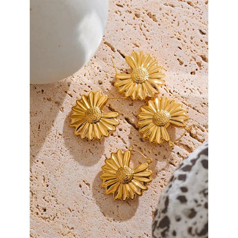 Turn heads with these exquisite floral-inspired earrings. The Sunlit Daisy Hoop Earrings are a dazzling celebration of beauty. growth. and timeless elegance. With a design that radiates sophistication. these gold-colored earrings are perfect for anyone who wants to infuse their outfit with a touch of nature-inspired charm. Whether you're attending a wedding. a garden party. or simply upgrading your everyday look. these earrings are sure to add a radiant glow to your style.
