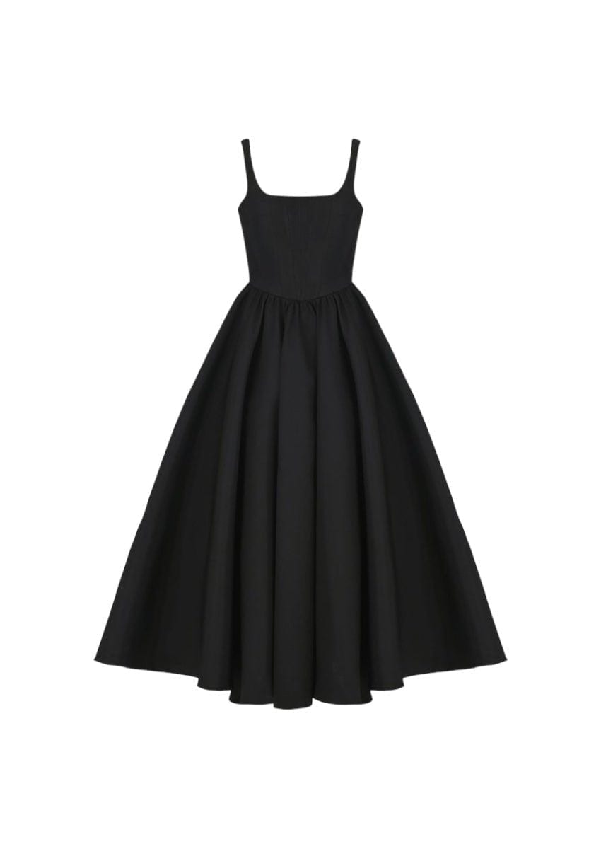 This dress has A square neckline offers a modern twist on the classic dress. providing a frame that complements all body types. The dress's structure is designed to accentuate the waist and flow gently over the hips.