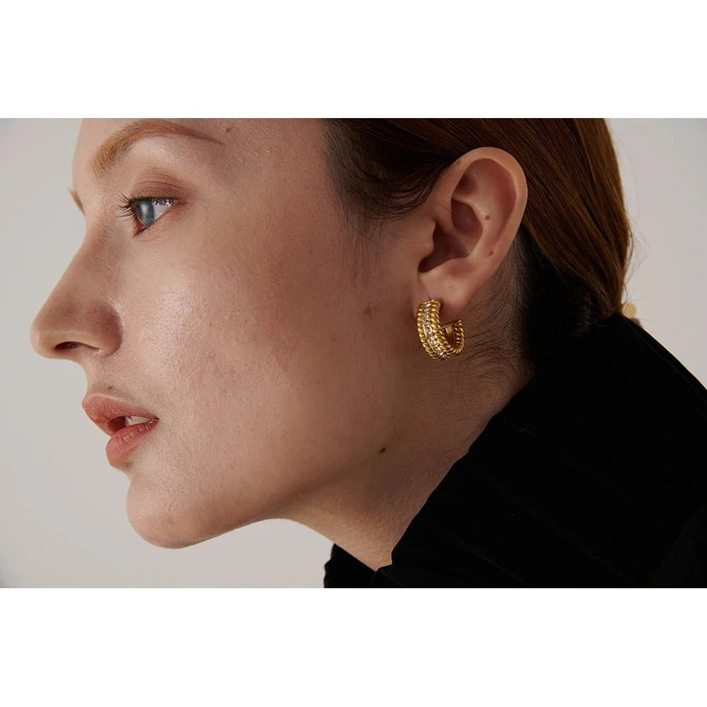Upgrade your jewelry collection with these Twist Rope Hoop Earrings. a perfect blend of elegance and modern design. Crafted with a luxurious PVD real gold-plated finish over stainless steel. these hoops feature a twisted rope texture that adds a touch of sophistication. The outer edge is lined with dazzling cubic zirconia stones. creating just the right amount of sparkle for any occasion. Whether you're dressing up for a special event or adding a hint of glam to your everyday look. these earrings are a must-have accessory!