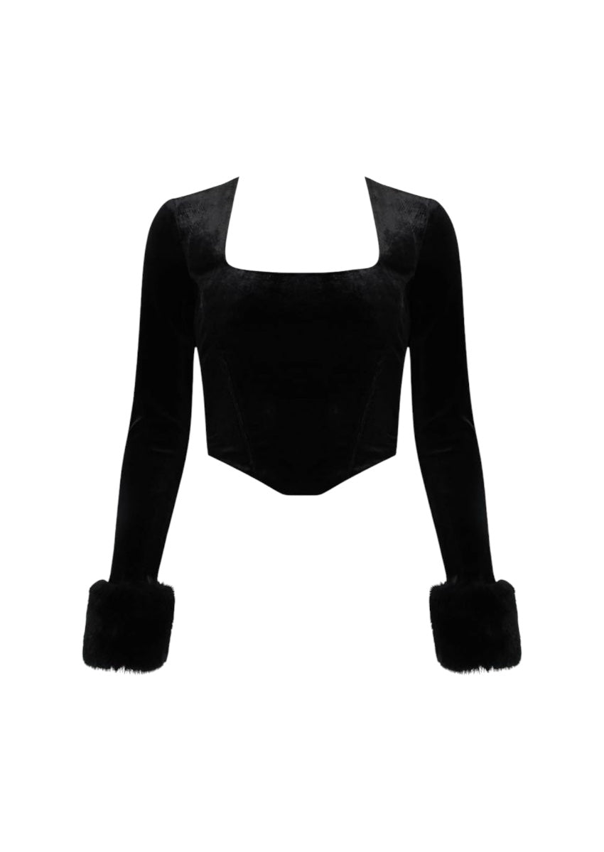 Turn heads with the Velvet Reverie Long Sleeve Top. a stunning blend of vintage glamour and modern sophistication. Crafted from soft. black velvet. this fitted top hugs your curves in all the right places. while the square neckline adds a touch of timeless elegance. The real showstopper? Large. fluffy black cuffs that bring a bold. dramatic flair to any outfit. Whether you're dressing up for a night out or adding a luxe edge to your everyday wardrobe. this top is the perfect statement piece.