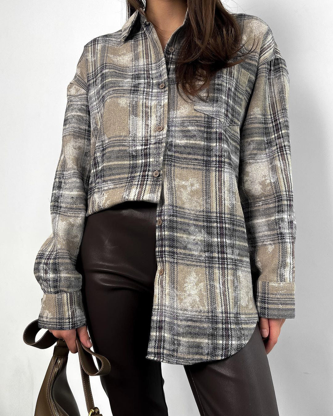 A perfect blend of comfort and style, this vintage-inspired brushed plaid shirt delivers aneffortlessly cool vibe.The relaxed, oversized fit combined with a subtle, brushed plaiddesign makes it a versatile piece that easily transitions from casual daywear to a chicevening look.Crafted from soft, textured fabric, it's ideal for layering or wearing as astatement piece.Pair it with leather pants or denim for an edgy touch to your outfit.