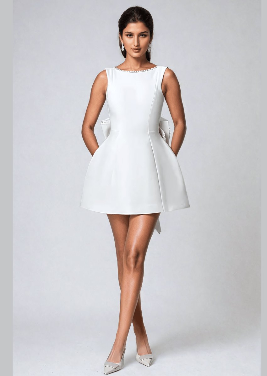 This white mini dress is a statement in minimalist elegance. Designed with a structured silhouette. the dress features a classic sleeveless cut and a full. flared skirt that adds a hint of volume and movement. The highlight of the dress is the oversized bow at the back. giving a playful yet sophisticated touch that's perfect for any special occasion. Ideal for bridal showers. cocktail parties. or formal gatherings. this dress captures the essence of timeless style.
