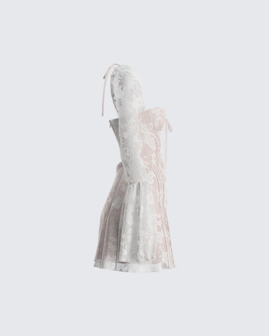 A: The fitted bodice flatters your shape. and the lace overlay adds an airy. graceful touch. The dress features a flared skirt that sits comfortably at the waist. creating an A-line silhouette that enhances your curves and allows for movement. It's designed to be comfortable while providing a beautiful and feminine fit.