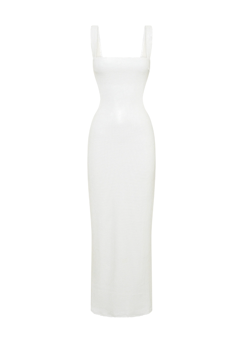 Elevate your wardrobe with our White Maxi Dress. designed for the modern woman who loves timeless sophistication with a trendy edge. With its sleek. shiny finish and form-fitting silhouette. this dress flatters your curves while adding a touch of glamour.