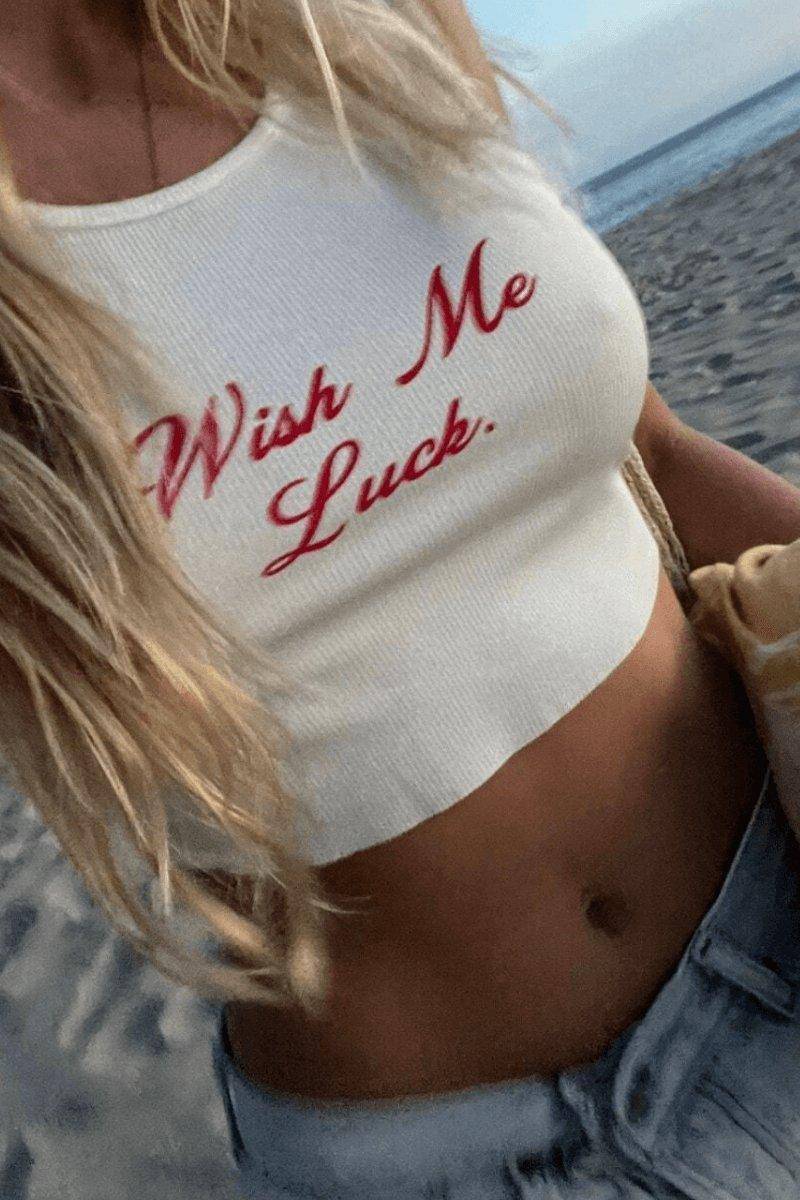 Add a touch of casual cool to your summer wardrobe with this WISH ME LUCK CROP! Designed for comfort and confidence. this top features a trendy letter print and a relaxed fit that's perfect for laid-back outings. from beach days to brunch dates. The lightweight fabric keeps you cool and stylish. while the classic sleeveless cut ensures easy. all-day wear. Whether paired with jeans. shorts. or your favorite skirt. this tank top is a must-have for anyone who loves summer style with a hint of attitude!