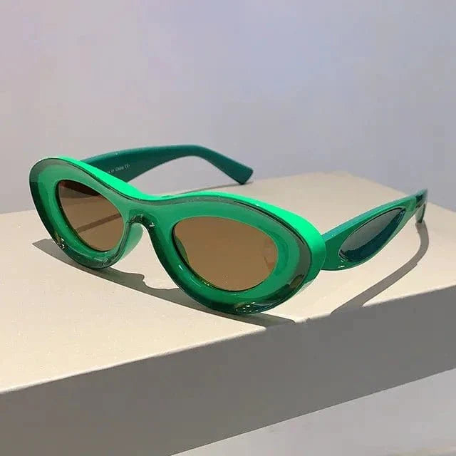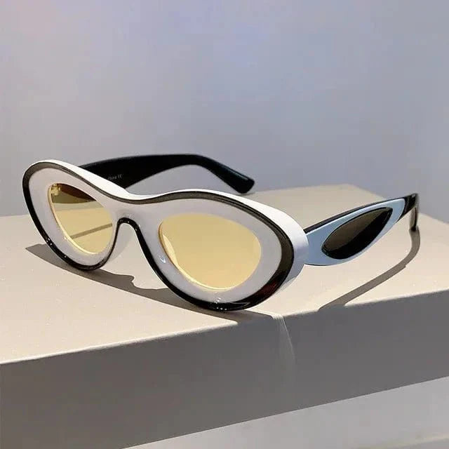 These sunglasses feature a distinct oval shape and thick frames. blending retro Y2K fashion with modern flair. They're perfect for those who love bold and vintage-inspired accessories.
