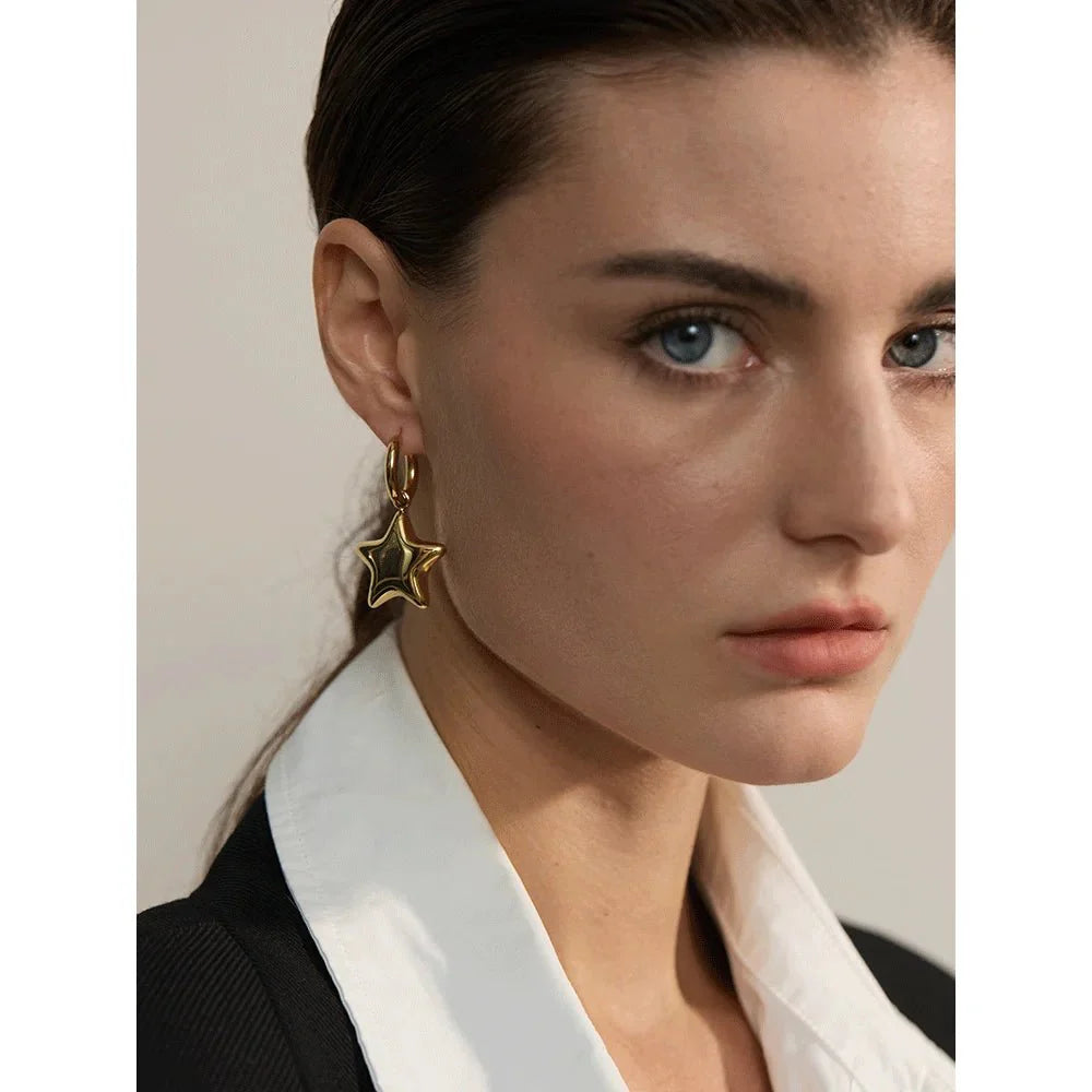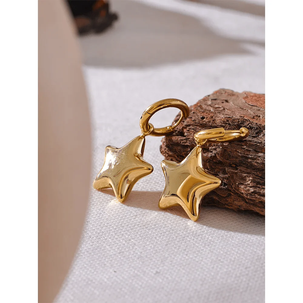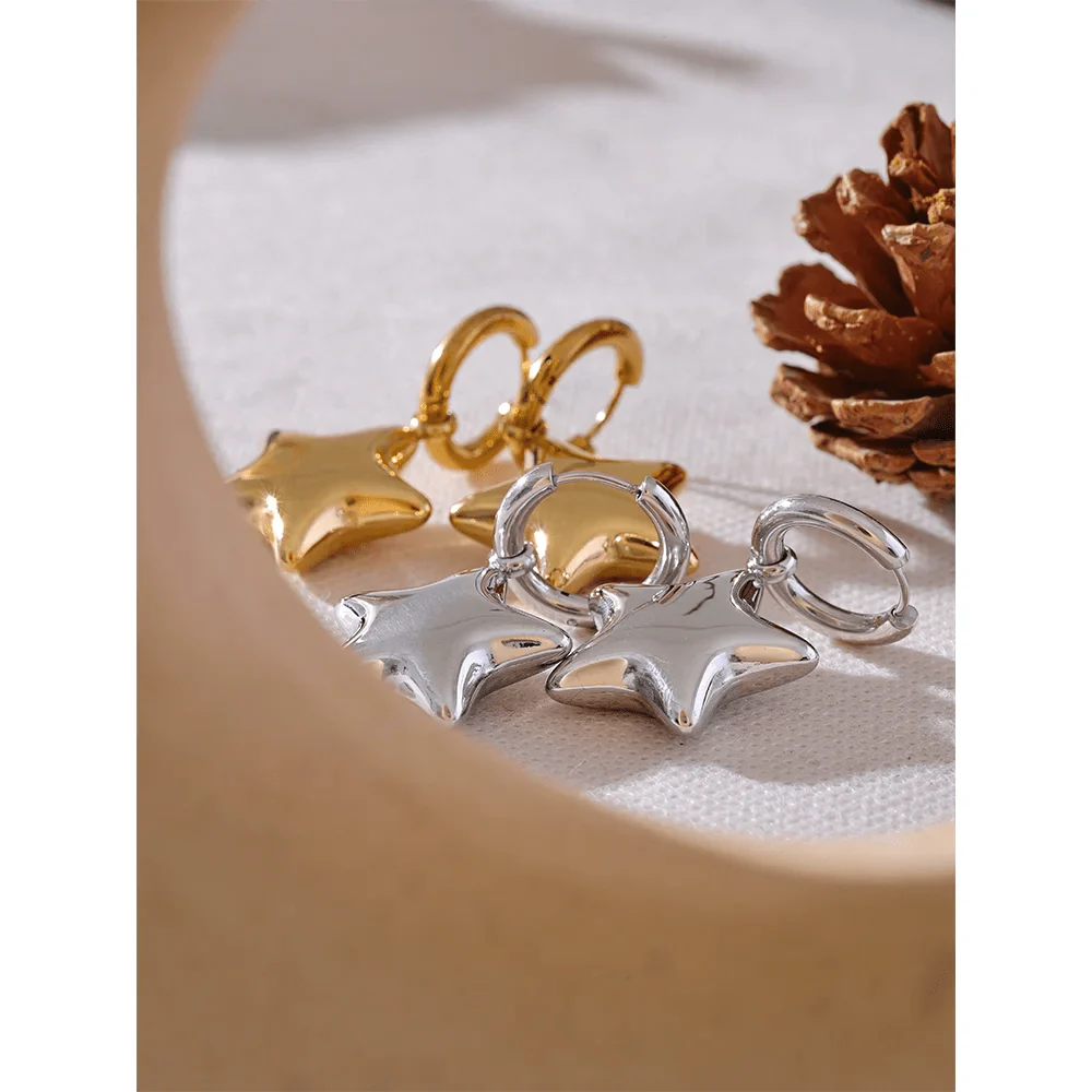 Shine bright with the Twinkle Star Dangle Earrings must-have accessory for celestial fashion lovers! This set of two pairs features stunning three-dimensional star-shaped hoops. designed to add a touch of magic to any look. Whether you choose the gold-plated or silver-plated pair. these earrings will elevate your style with their smooth. mirror-like shine. Perfect for day-to-night wear. they bring a dreamy. starry glow to every outfit!